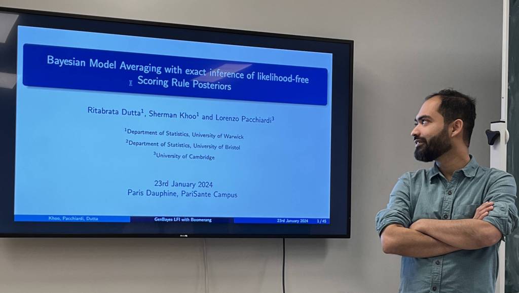 On the 23th of January 2024 at PariSanté Campus, Ritabrata Dutta (Warwick University) introduced « Bayesian Model Averaging with exact inference of likelihood- free Scoring Rule Posteriors » at the All-About-That-Bayes seminar. This seminar, held at OCEAN’s PariSanté campus offices, brought together teams from Warwick and Dauphine as well as Paris statisticians.